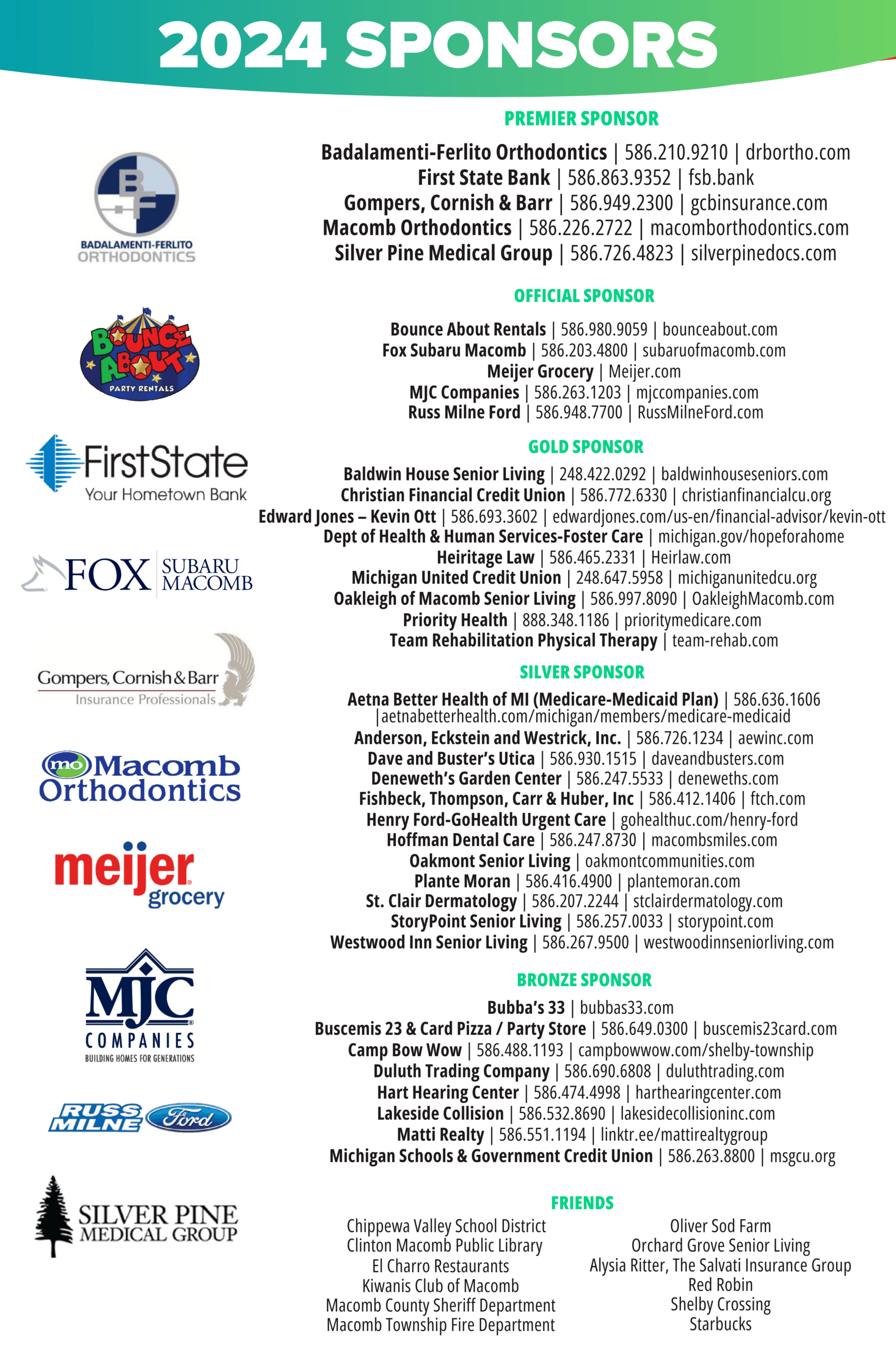 The Macomb Township Parks and Recreation Department would like to give a special thank you to our sponsors and friends! The businesses and organizations listed below have made a contribution to our department for our special events and programs. It is the generosity of our sponsors that allows us to continue making a difference and enhancing the quality of life here in Macomb Township. If you have questions about becoming a sponsor, please contact Lacey Ward at wardl@macomb-mi.gov.